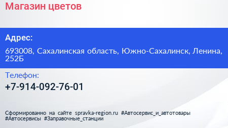 Магазин цветов по адресу 693008, Сахалинская область, Южно-Сахалинск, Ленина, 252Б в дальнейшем Организация, размещена в следующих категориях: