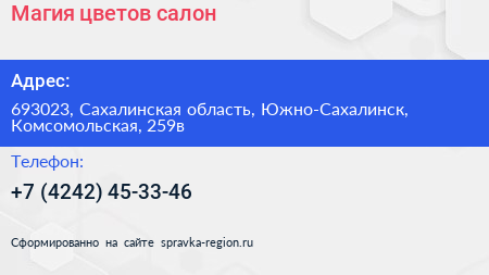 Магия цветов, салон по адресу 693023, Сахалинская область, Южно-Сахалинск, Комсомольская, 259в в дальнейшем Организация, размещена в следующих категориях:
