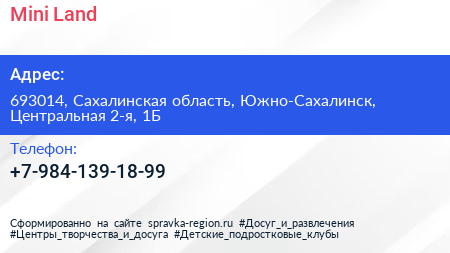 Mini Land по адресу 693014, Сахалинская область, Южно-Сахалинск, Центральная 2-я, 1Б в дальнейшем Организация, размещена в следующих категориях: