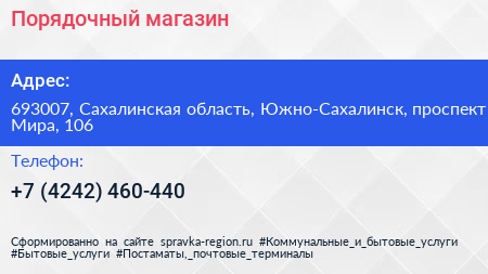 Порядочный, магазин по адресу 693007, Сахалинская область, Южно-Сахалинск, проспект Мира, 106 в дальнейшем Организация, размещена в следующих категориях: