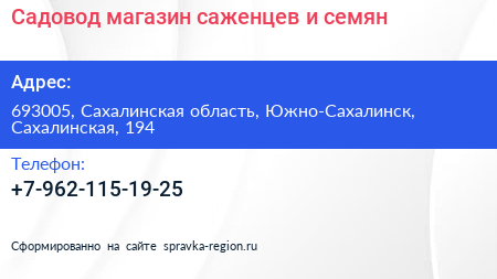 Садовод, магазин саженцев и семян по адресу 693005, Сахалинская область, Южно-Сахалинск, Сахалинская, 194 в дальнейшем Организация, размещена в следующих категориях: