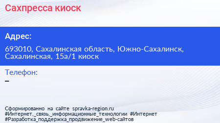 Сахпресса, киоск по адресу 693010, Сахалинская область, Южно-Сахалинск, Сахалинская, 15а/1 киоск в дальнейшем Организация, размещена в следующих категориях: