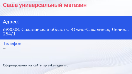 Саша, универсальный магазин по адресу 693008, Сахалинская область, Южно-Сахалинск, Ленина, 254/1 в дальнейшем Организация, размещена в следующих категориях: