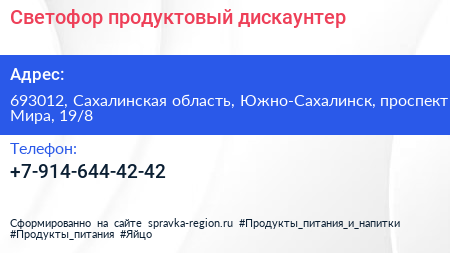 Светофор, продуктовый дискаунтер по адресу 693012, Сахалинская область, Южно-Сахалинск, проспект Мира, 19/8 в дальнейшем Организация, размещена в следующих категориях: