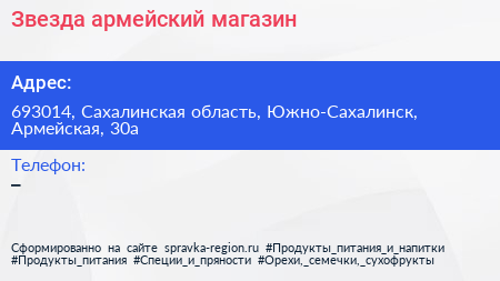 Звезда, армейский магазин по адресу 693014, Сахалинская область, Южно-Сахалинск, Армейская, 30а в дальнейшем Организация, размещена в следующих категориях: