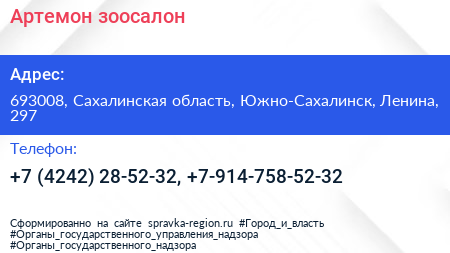 Артемон, зоосалон по адресу 693008, Сахалинская область, Южно-Сахалинск, Ленина, 297 в дальнейшем Организация, размещена в следующих категориях: