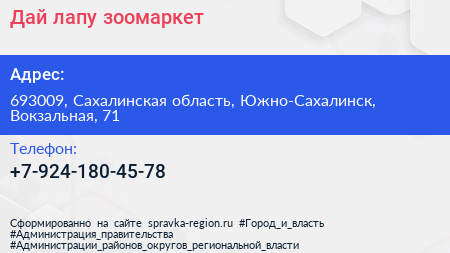 Дай лапу, зоомаркет по адресу 693009, Сахалинская область, Южно-Сахалинск, Вокзальная, 71 в дальнейшем Организация, размещена в следующих категориях: