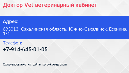 Доктор Vet, ветеринарный кабинет по адресу 693013, Сахалинская область, Южно-Сахалинск, Есенина, 1/1 в дальнейшем Организация, размещена в следующих категориях: