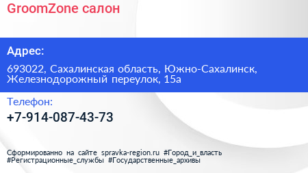 GroomZone, салон по адресу 693022, Сахалинская область, Южно-Сахалинск, Железнодорожный переулок, 15а в дальнейшем Организация, размещена в следующих категориях: