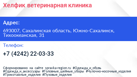 Хелфик, ветеринарная клиника по адресу 693007, Сахалинская область, Южно-Сахалинск, Тихоокеанская, 31 в дальнейшем Организация, размещена в следующих категориях: