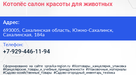 Котопёс, салон красоты для животных по адресу 693005, Сахалинская область, Южно-Сахалинск, Сахалинская, 184а в дальнейшем Организация, размещена в следующих категориях: