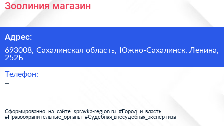 Зоолиния, магазин по адресу 693008, Сахалинская область, Южно-Сахалинск, Ленина, 252Б в дальнейшем Организация, размещена в следующих категориях: