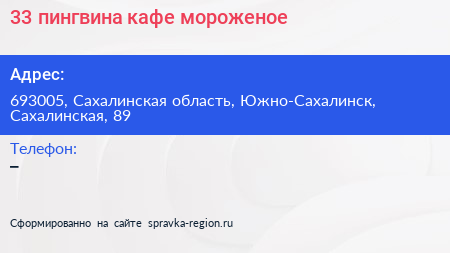 33 пингвина, кафе-мороженое по адресу 693005, Сахалинская область, Южно-Сахалинск, Сахалинская, 89 в дальнейшем Организация, размещена в следующих категориях: