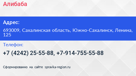 Алибаба по адресу 693009, Сахалинская область, Южно-Сахалинск, Ленина, 125 в дальнейшем Организация, размещена в следующих категориях: