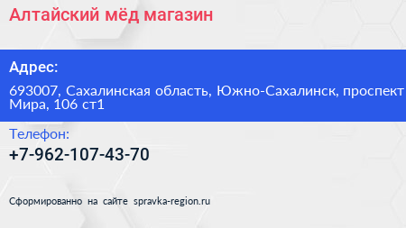 Алтайский мёд, магазин по адресу 693007, Сахалинская область, Южно-Сахалинск, проспект Мира, 106 ст1 в дальнейшем Организация, размещена в следующих категориях: