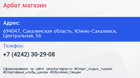 Арбат, магазин по адресу 694047, Сахалинская область, Южно-Сахалинск, Центральная, 56 в дальнейшем Организация, размещена в следующих категориях: