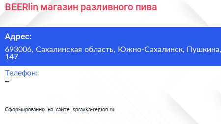 BEERlin, магазин разливного пива по адресу 693006, Сахалинская область, Южно-Сахалинск, Пушкина, 147 в дальнейшем Организация, размещена в следующих категориях: