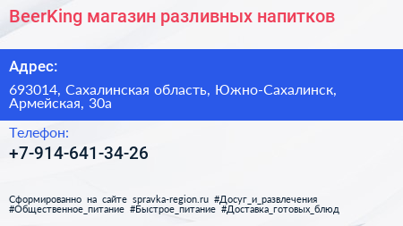 BeerKing, магазин разливных напитков по адресу 693014, Сахалинская область, Южно-Сахалинск, Армейская, 30а в дальнейшем Организация, размещена в следующих категориях: