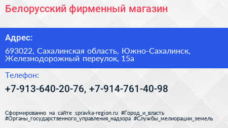 Белорусский фирменный, магазин по адресу 693022, Сахалинская область, Южно-Сахалинск, Железнодорожный переулок, 15а в дальнейшем Организация, размещена в следующих категориях: