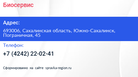 Биосервис по адресу 693006, Сахалинская область, Южно-Сахалинск, Пограничная, 45 в дальнейшем Организация, размещена в следующих категориях:
