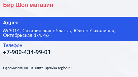 Бир Шоп, магазин по адресу 693014, Сахалинская область, Южно-Сахалинск, Октябрьская 1-я, 46 в дальнейшем Организация, размещена в следующих категориях: