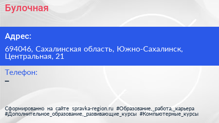 Булочная по адресу 694046, Сахалинская область, Южно-Сахалинск, Центральная, 21 в дальнейшем Организация, размещена в следующих категориях: