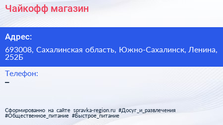 Чайкофф, магазин по адресу 693008, Сахалинская область, Южно-Сахалинск, Ленина, 252Б в дальнейшем Организация, размещена в следующих категориях: