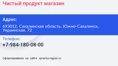 Чистый продукт, магазин по адресу 693012, Сахалинская область, Южно-Сахалинск, Украинская, 72 в дальнейшем Организация, размещена в следующих категориях: