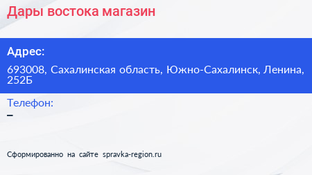 Дары востока, магазин по адресу 693008, Сахалинская область, Южно-Сахалинск, Ленина, 252Б в дальнейшем Организация, размещена в следующих категориях: