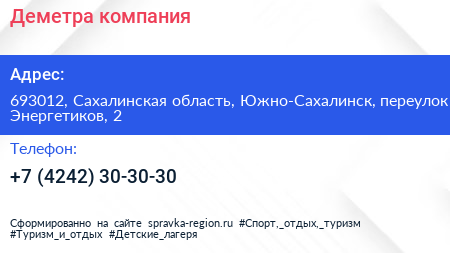 Деметра, компания по адресу 693012, Сахалинская область, Южно-Сахалинск, переулок Энергетиков, 2 в дальнейшем Организация, размещена в следующих категориях: