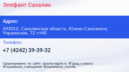 Элефант Сахалин по адресу 693012, Сахалинская область, Южно-Сахалинск, Украинская, 72 ст40 в дальнейшем Организация, размещена в следующих категориях: