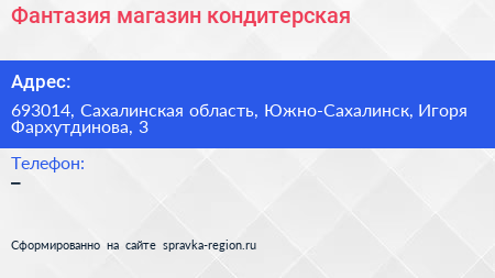 Фантазия, магазин-кондитерская по адресу 693014, Сахалинская область, Южно-Сахалинск, Игоря Фархутдинова, 3 в дальнейшем Организация, размещена в следующих категориях: