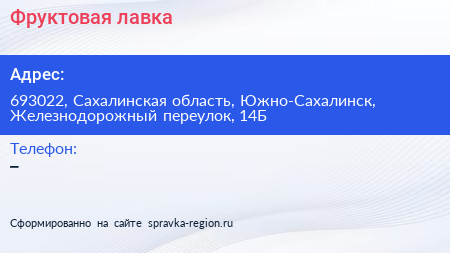 Фруктовая лавка по адресу 693022, Сахалинская область, Южно-Сахалинск, Железнодорожный переулок, 14Б в дальнейшем Организация, размещена в следующих категориях: