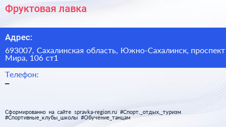 Фруктовая лавка по адресу 693007, Сахалинская область, Южно-Сахалинск, проспект Мира, 106 ст1 в дальнейшем Организация, размещена в следующих категориях: