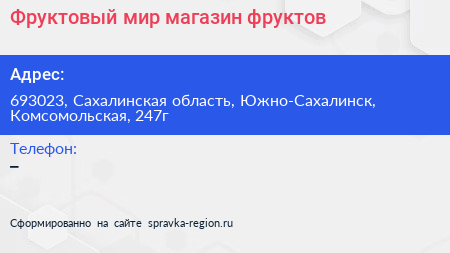 Фруктовый мир, магазин фруктов по адресу 693023, Сахалинская область, Южно-Сахалинск, Комсомольская, 247г в дальнейшем Организация, размещена в следующих категориях: