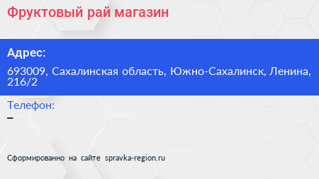 Фруктовый рай, магазин по адресу 693009, Сахалинская область, Южно-Сахалинск, Ленина, 216/2 в дальнейшем Организация, размещена в следующих категориях: