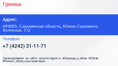 Гренаш по адресу 693005, Сахалинская область, Южно-Сахалинск, Холмская, 7/2 в дальнейшем Организация, размещена в следующих категориях: