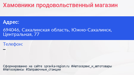 Хамовники, продовольственный магазин по адресу 694046, Сахалинская область, Южно-Сахалинск, Центральная, 77 в дальнейшем Организация, размещена в следующих категориях: