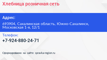 Хлебница, розничная сеть по адресу 693904, Сахалинская область, Южно-Сахалинск, Московская 1-я, 12/1 в дальнейшем Организация, размещена в следующих категориях: