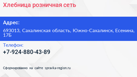 Хлебница, розничная сеть по адресу 693013, Сахалинская область, Южно-Сахалинск, Есенина, 17Б в дальнейшем Организация, размещена в следующих категориях: