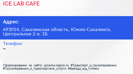 ICE LAB.CAFE по адресу 693014, Сахалинская область, Южно-Сахалинск, Центральная 2-я, 1Б в дальнейшем Организация, размещена в следующих категориях: