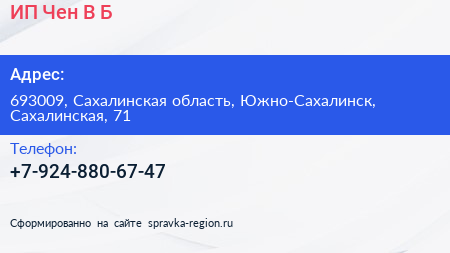 ИП Чен В.Б. по адресу 693009, Сахалинская область, Южно-Сахалинск, Сахалинская, 71 в дальнейшем Организация, размещена в следующих категориях: