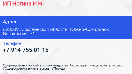 ИП Ногина И.Н. по адресу 693009, Сахалинская область, Южно-Сахалинск, Вокзальная, 71 в дальнейшем Организация, размещена в следующих категориях:
