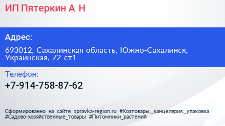 ИП Пятеркин А.Н. по адресу 693012, Сахалинская область, Южно-Сахалинск, Украинская, 72 ст1 в дальнейшем Организация, размещена в следующих категориях: