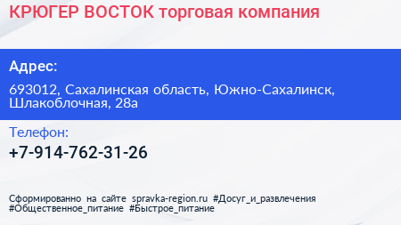 КРЮГЕР ВОСТОК, торговая компания по адресу 693012, Сахалинская область, Южно-Сахалинск, Шлакоблочная, 28а в дальнейшем Организация, размещена в следующих категориях: