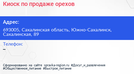 Киоск по продаже орехов по адресу 693005, Сахалинская область, Южно-Сахалинск, Сахалинская, 89 в дальнейшем Организация, размещена в следующих категориях: