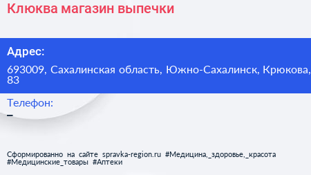 Клюква, магазин выпечки по адресу 693009, Сахалинская область, Южно-Сахалинск, Крюкова, 83 в дальнейшем Организация, размещена в следующих категориях:
