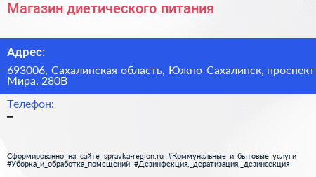Магазин диетического питания по адресу 693006, Сахалинская область, Южно-Сахалинск, проспект Мира, 280В в дальнейшем Организация, размещена в следующих категориях: