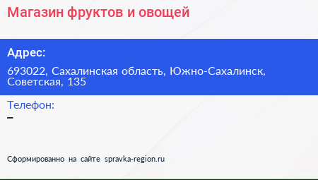 Магазин фруктов и овощей по адресу 693022, Сахалинская область, Южно-Сахалинск, Советская, 135 в дальнейшем Организация, размещена в следующих категориях:
