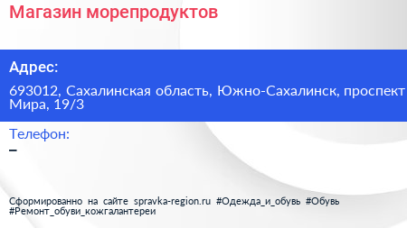 Магазин морепродуктов по адресу 693012, Сахалинская область, Южно-Сахалинск, проспект Мира, 19/3 в дальнейшем Организация, размещена в следующих категориях: